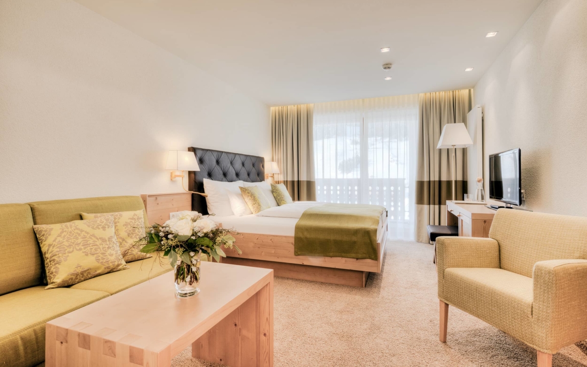 Our Superior Double Room is a very cosy and bright double room with fine carpeted floor and Swiss pine furnishings. From the balcony you can enjoy the fabulous view of the surrounding mountains and the village centre, easy to reach on foot. Our house is located directly on the slopes, so you can take off your skis in front of the door. You really cannot get any closer!